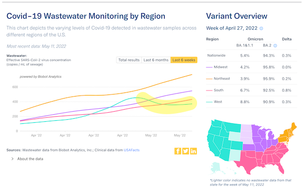 Lambert here: I am but a humble tape-watcher, but if some trusting, non-realist soul tells you that “Covid is over,” you can tell them that cases are up, transmission is up, test positivity is up, hospitalization is up, rapid riser counties are up, and wastewater is up, too. And this is all from data designed to support the narrative that “Covid is over,” and gamed within an inch of its life. So, if signals like that are flashing red, consider what the real signal must be like. (Note also this is all with BA.2 only, and with what the establishment considers an “immune wall” made from vaccination and prior infection. Since semper aliquid novi Africam adferre, and we’ve let ‘er rip at the airports…. Well, I just hope we get lucky with BA.4 and BA.5. “God has a special providence for fools, drunkards, and the United States of America.” –Otto von Bismarck.