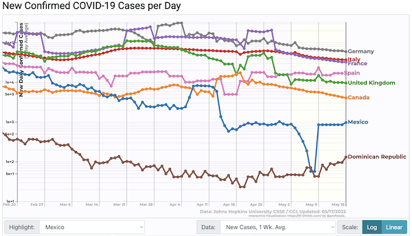 Broadly down, but is that a data thing with Mexico? (Note the quality of these numbers varies wildly. For example, the UK is cutting back on testing data.