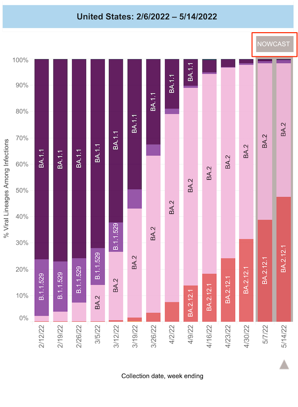 The other thing I’m not liking is that big time lag with the variants. April 27? I want to know about BA.4 and BA.5 (dubbed “variants of concern” by The European Centre for Disease Prevention and Control (ECDC) last week, but not WHO). This is the CDC’s readable report on variant proportions: