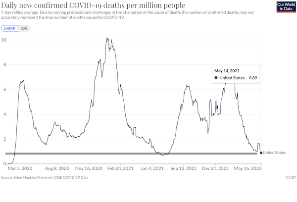 “US Set to Extend Covid-19 Public Health Emergency Past July” [Bloomberg]. “The US government will extend the Covid-19 public-health emergency past mid-July, continuing pandemic-era policies as the nearly 2 1/2-year outbreak drags on. The Department of Health and Human Services has repeatedly renewed the public-health emergency since implementing it in January 2020. The declaration allows the US to grant emergency authorizations of drugs, vaccines and other medical countermeasures, as well as administer those products to millions of people at no out-of-pocket cost. It’s also enabled millions of Americans to get health coverage through Medicaid, among other benefits. On April 16, HHS extended the public-health emergency an additional 90 days through mid-July. The declaration will be extended beyond that period, according to a person familiar with the matter, who asked not to be identified because the details aren’t public. That means various measures to relax restrictions in how care is accessed across the health system will continue. An HHS spokesperson said the public-health emergency remains in effect, and the department will continue to provide a 60-day notice to states before any possible termination or expiration.”