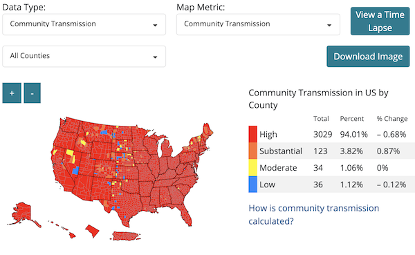 Here is CDC’s interactive map by county set to community transmission. This is the map CDC wants only hospitals to look at, not you. For July 21, 2020: