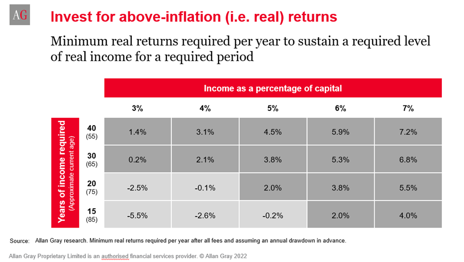 To illustrate this, use the following example: an investor who is withdrawing 4% of their capital and wants to raise inflation each year, and is planning a 30-year retirement, would require real returns of 2.1% per annum over 30. years, as indicated in the following table.