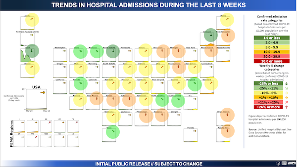 This map is very dynamic! Now the orangization has bounced around down South. (Note trend, whether up or down, is marked by the arrow, at top. Admissions are presented in the graph, at the bottom. So it’s possible to have an upward trend, but from a very low baseline.)